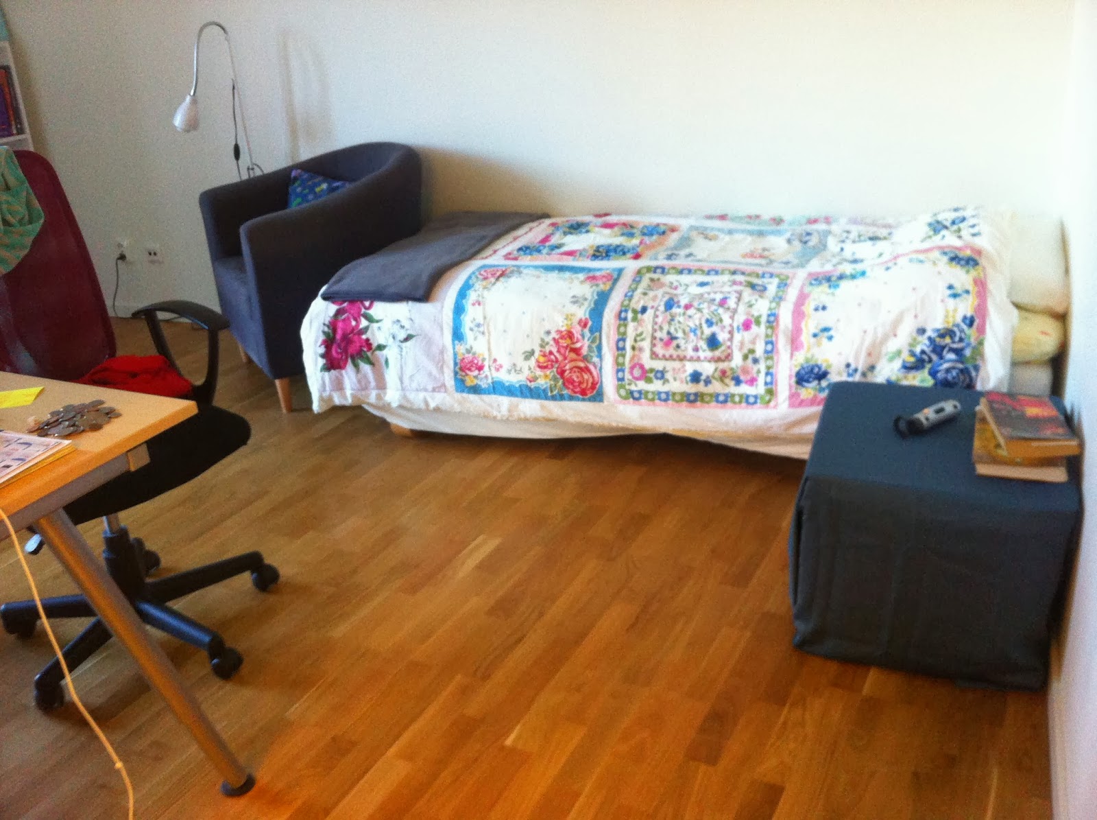 Well, that's it. That's where I eat, sleep, study and relieve myself. It's perfect for my life as a student. I'm slowly getting to know some of my neighbors and enjoying them. Tonight, I am invited to a potluck at my upstairs neighbors apartment. I've been asked to bring an American desert. I'm thinking I might attempt to make pumpkin donuts. We shall see.